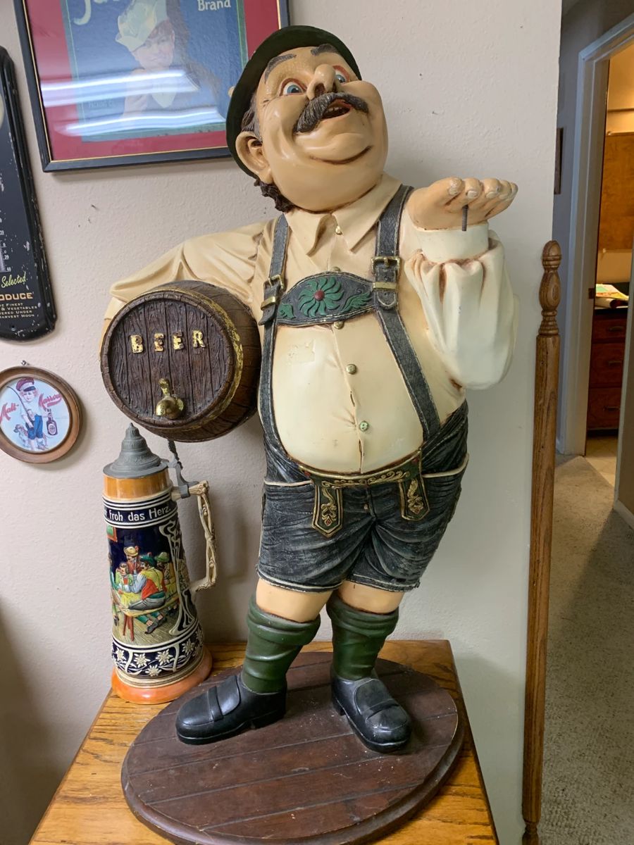Welcome to a house full of nautical, advertising, steins, & Americana collections! Framed Art covers every wall!! German Oktoberfest waiter statue Americana metal banks Nautical: lamps, brass fittings for boats, lanterns, clocks, compasses, art including prints of ships, vintage travel, ships built in bottles, model ships etc. Fire extinguisher lamps Gorgeous Tiffany- like lamp Novelty canons Vintage 1940’s cap guns German Steins of all sizes and styles Furniture: dining table and chairs, coffee tables, chairs, couch, rugs Washer and dryer Colored glass Large stamp collection Old Navy traditional American Tattoo art, tattoo, flash sheets and books Huge collection of refrigerator...