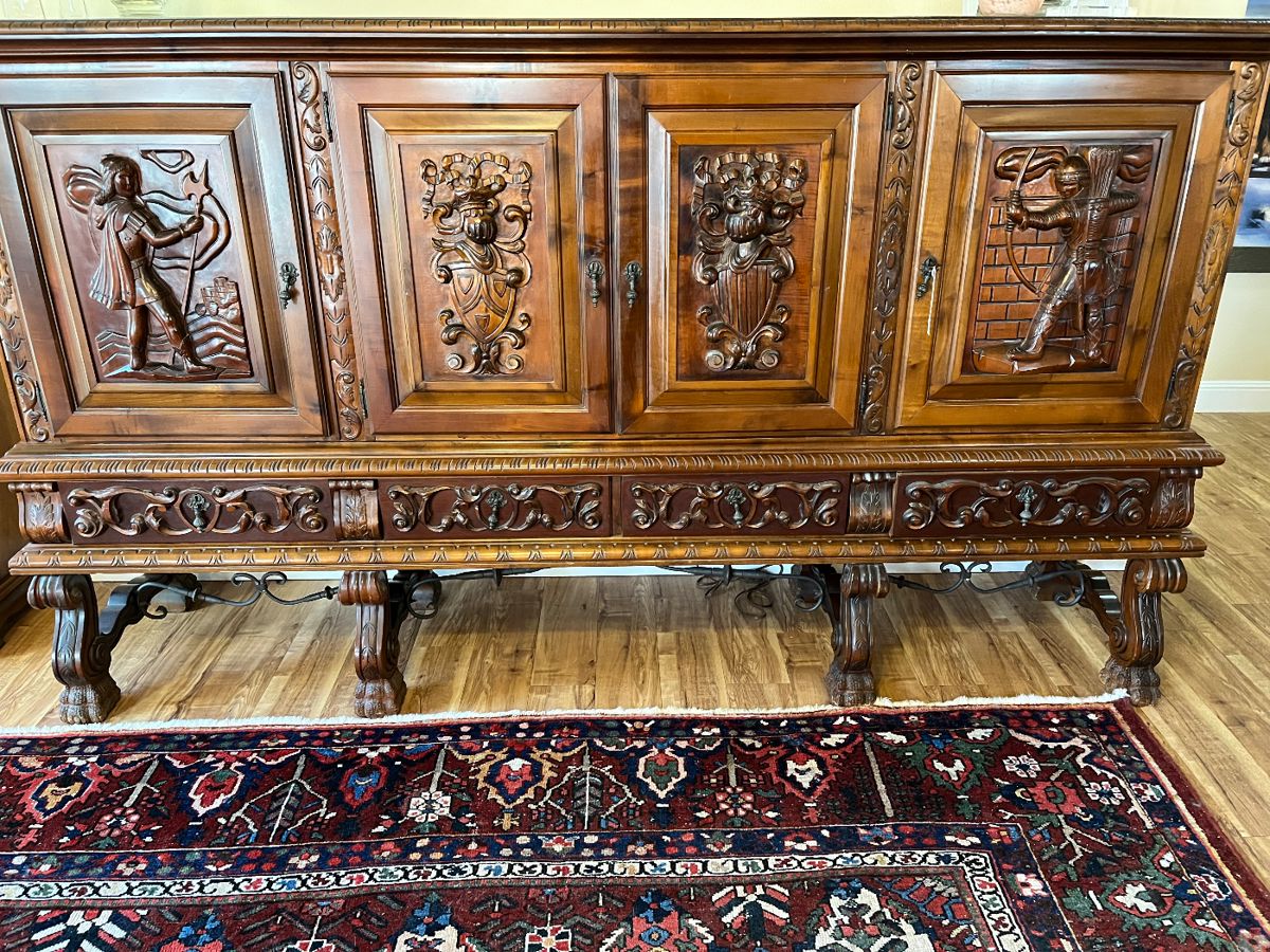 Beautiful home, with designer style furniture, artwork, and decor, including European carved large cabinet, antique oak clawfoot table with carved faces and chairs, Stickley cherry bookcase/desk, 1850s furniture including marble top pieces, 1700s grandfather clock, several other antique clocks, French style desk, 1910 Mills slot machine, antique hand woven carpets, huge cats collection including Lenox, Lalique, Swavorsky crystal & more, lots of collectibles and more, artwork from listed artists, quality kitchenware, lots of all kinds of holiday items, Loads of quality collectible Christmas items, Lenox nativity set, lots of special ornament collections, lots of vintage Fitz & Floyd collectible items,...