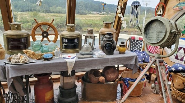 Antique boat lights, Nautical decor, Vintage Navy signal light, many dressers, several tables, desks, 2 beds, hide a bed couch, Futon, Hutches, Vintage toys, Linens, Several sewing machines, Quilts, Milk cans, Garden decor, Books, Bottles, Dryer, Many clocks, Stain glass lamp, Chairs, Rockers, Vintage clothes, furs, Big Lebowski sytle sweaters, Mirrors, Vintage Dental light, Dutch Mosert Print, Hall tree, LPs, DVDs, CDs, Tools, Sporting goods, Bikes, Skis, about 50ft radio tower (in 3 sections) Fishing poles and tackle. Not all pictured or listed! Inside the house & garage!