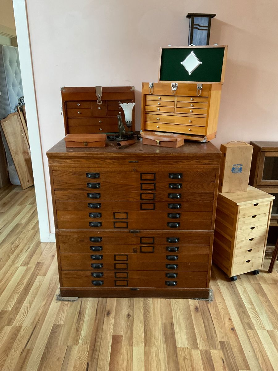 antique furniture, oak map cabinet, oak file cabinets, sofa, dining table and chairs, mid century chest