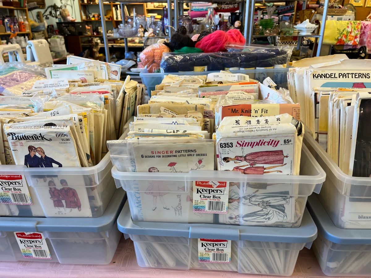 The store is full again and ready for another sale. 1000s of vintage sewing patterns. Additional vintage and modern fabric added. Vintage Glass Canister Set. Large selection of glass, brass, and china. Silver Plate flatware and hollowware items. Lamps. Antique lights. Linens, hankies, pillowslips, and table covers. More jewelry added. Quilts. Sets of Spode and china. Many prices have been reduced. Hope to see everyone this weekend.