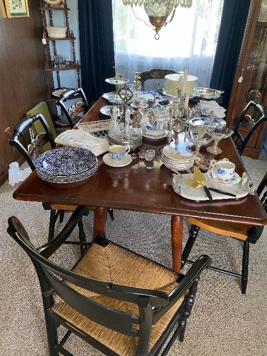 Complete contents of lovely four bedroom home. Amazing selection of Hitchcock furniture includes :set of six dining chairs (four eagle - back side chairs, one rush- seat captain’s chair, and rush-seat first mate chair), twin bed, full bed, three dressers, two mirrors, and two side tables. Other furniture includes: round pedestal oak dining table, Pennsylvania house dropleaf dining table, curved curio cabinet, carved mahogany chairs & marble top tables, corner shelves and more. Quality kitchen and dining ware, including Orrefors Crystal, sterling silver pieces, beautiful dish sets including Bla Blom Sweden, teacup collection, Freemason memorabilia, Gold & silver jewelry, numerous...