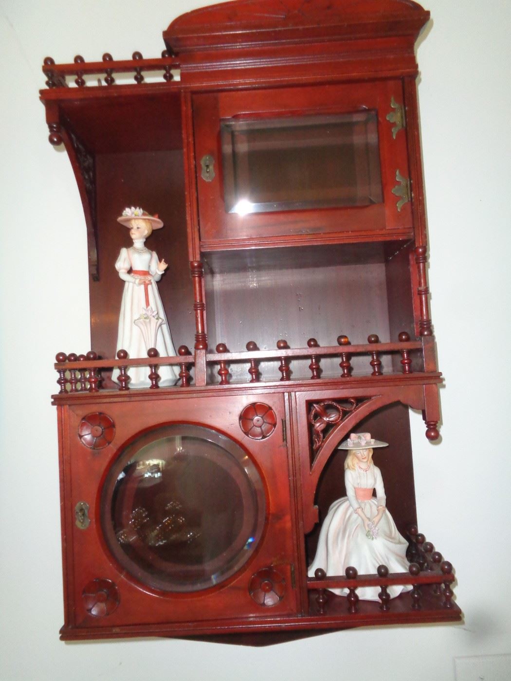 ANTIQUE HANGING CURIO CABINET Also Three Large Curio Cabinets with Mirrored Backs, Two Tall Lighted Curio Cabinets, Cable Nelson Spinet Piano, Ethan Allen Dinette Set Set Coffee and End Tables, Rocker Recliner Kitchen Set for Two, Antique Piano Stool, Vanity with Tri Fold Mirror and Bench, Small China Hutch, Server, Maple Desks with Drawers Below, Dressers Twin Bed, Steamer Trunk, Stereo System. Record Player, Mirrors, Artwork, Jewelry Armoire, Vintage Rocker, Linens and Ladies Clothes Jewelry, Many Sewing Millinary Items, Fabric Etc. Store Display Cabinet, Brother and Singer Sewing Machines, Germany Hummels, Hummel Lamps, Red Heads, China Head Dolls, Syracuse and...