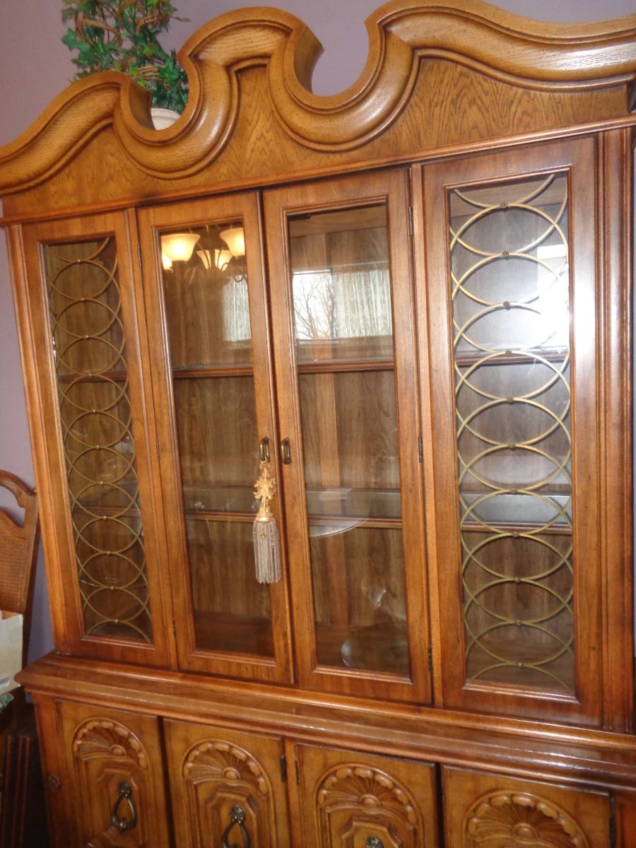 LOVELY WELL TAKEN CARE OF FURNISHINGS !!!!!!!! Large China Cabinet, Dining Table with 6 Chairs, Server-Bar. Like New Flex steel Sofa and Matching Chair, Corner Bow Front Curio Cabinet, Cherry Coffee Table, End And Sofa Tables, Brass Lamps, Foreside Chair, Vintage Wall Mirrors, Flat Screen TV And Stand, Large Sofa, Rocker Recliner, Cherry Queen Bed Set- Chest on Chest, Large Dresser and Nightstand, Jewelry Armoire, Basset Chest Drawers, Student Desk And Twin Bed, Small Kitchen Set, GE Washer and Dryer, GE Gas Stove with Self Clean Oven, Amana Refrigerator, Nice KItchenware, Microwave, Jewelry, Flatware, Stemware, Dinnerware, Christmas, Linens Drapes, Bedding...