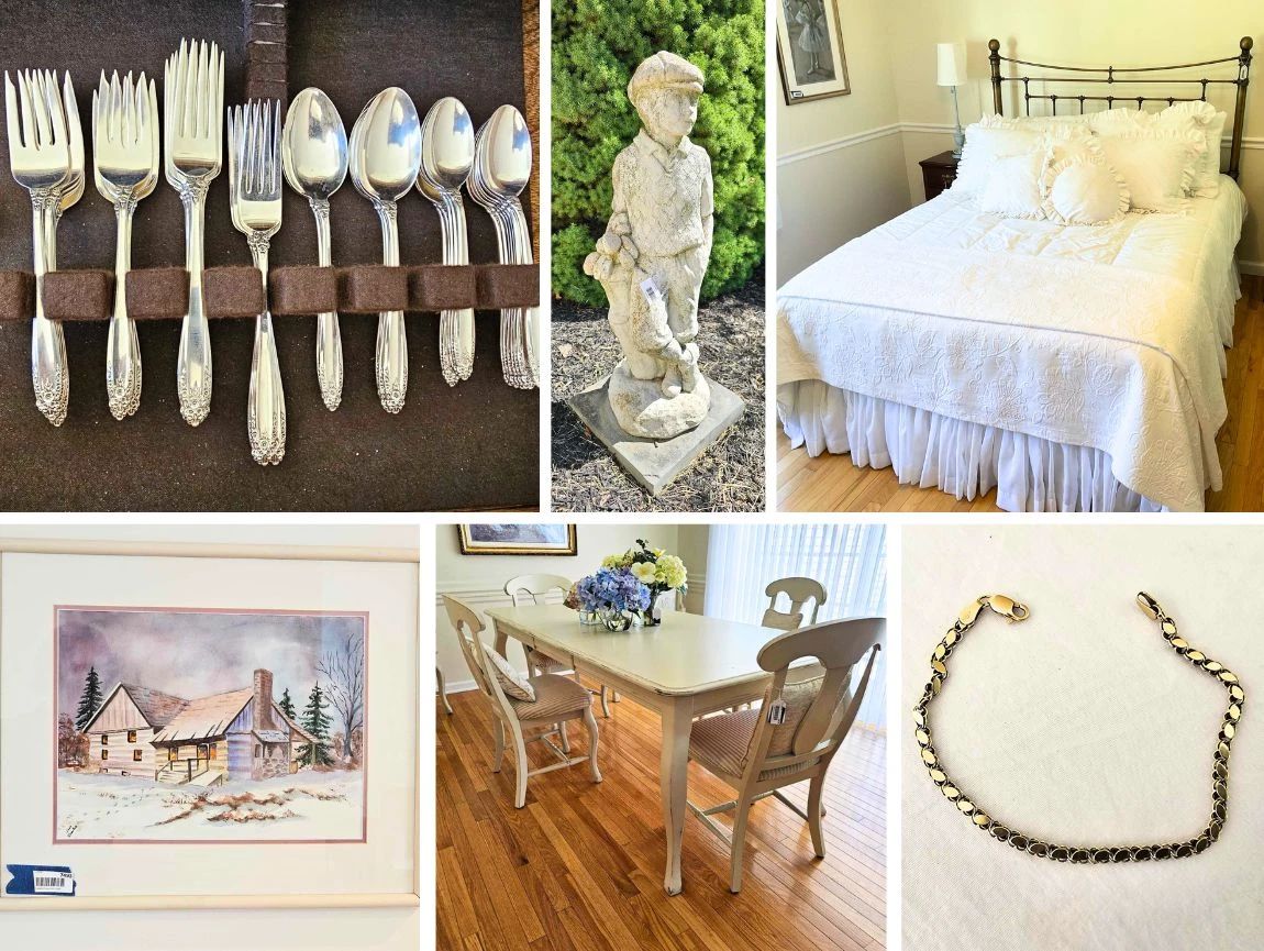 ONLINE NOW through Sept. 15! FURNITURE: Yamaha Clavinova digital piano; dining table/chairs; Louis XV settee & arm chairs; Kling chests of drawers; white high post bed; wicker chests & end stands; upholstered stools; desks; drop leaf table; wrought iron pedestal; rattan bar stools; entertainment cabinets; GOLD JEWELRY: Rings, pendants, bracelets and chains in 10k-18k; HOUSEWARES: Sterling “Prelude” flatware set; collection Blue & White porcelain; Polish pottery; Fostoria “Navarre” elegant glass service; Morgantown cobalt stemware; Lenox china; paintings & prints; mirrors; lamps; Persian rugs; fur coat; Sony & Samsung TVs; Bose Wave music system; Singer cabinet sewing machine; kitchenware; hand &...