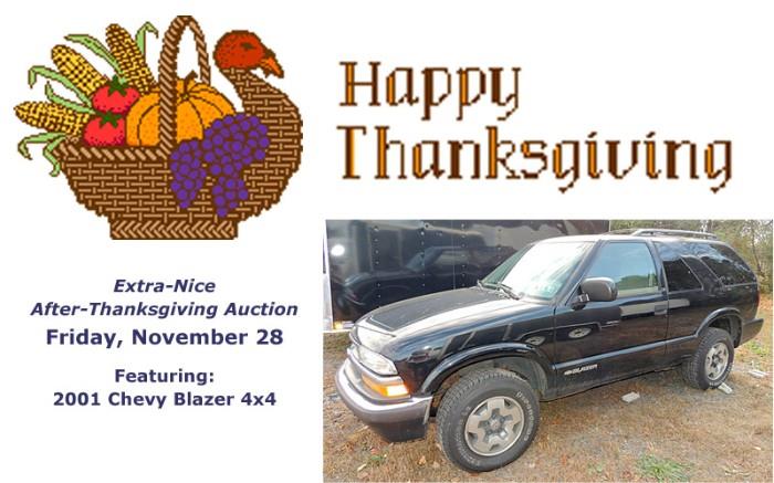 Extra-Nice After-Thanksgiving Public Estate Variety Auction Friday, November 28, 2014 Start Time: 3PM (Back Room) | 4PM (Front Room) | 8PM (Estate Auto) Previews: All-day Friday, from 9AM There will be no Thursday preview this week. We wish everyone a happy and safe Thanksgiving! Selling Items from Main Line, PA and Delaware Valley Estates, Homes, and Collections Featuring: 2001 Chevy Blazer LS 4x4 Estate Auto Antique & Quality Reproduction Furniture | Decorative Arts | Fine Art Country Antiques & Primitives | Clocks & Carpets Silver | Fine Porcelains & China | Glass & Art Glass | Art Pottery Estate Fine...
