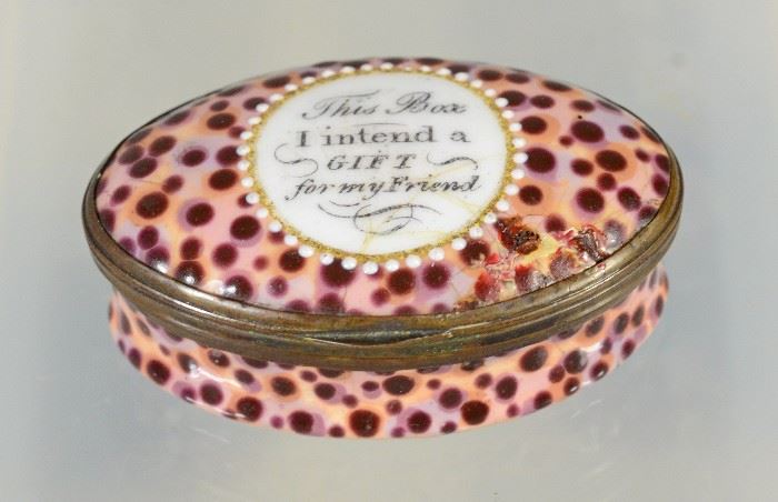 Lot Description LowEst HighEst 12001 Oval Battersea Bilston English enamel motto box, 2-1/8" w, enameled to look like a cowrie shell, "This Box I Intend a Gift For My Friend", original mirror $300 $500 12002 Oval Battersea Bilston English enamel motto box, 1-3/4" w, "Open This Box and To Your Eyes It Will Reflect the Nymph I Prize", "Happy Were I Did It Discover Whilst Thus I Gaze Your Fave'rite Lover", Manheim label to interior with original mirror $200 $400 12003 Oval Battersea Bilston English enamel motto box, 1-1/2", original mirror, "A Person Without Money and None He Can Borrow...