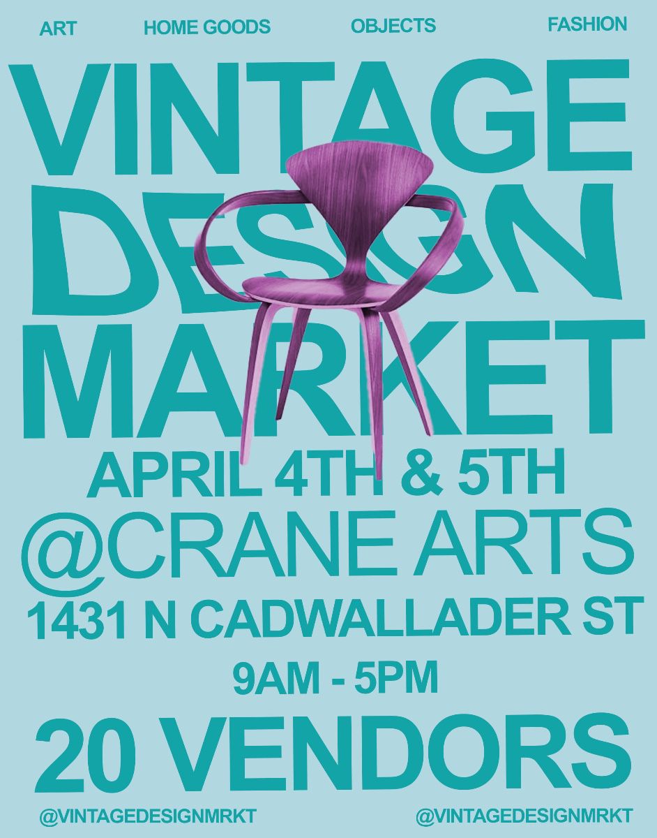 Vintage Design Market featuring a curated group of dealers offering vintage furniture, home décor, art, collectibles, and clothing. Expect a mix of mid-century, antique, and unique one-of-a-kind pieces.