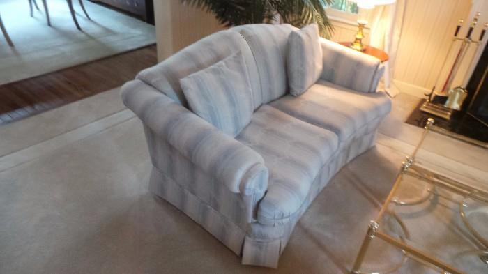 FURNITURE: Jasper Drop Front Cherry Secretary/Bookcase, Cane Back and Upholstered Seat Arm Chair, Pair of Hollywood Regency Style Brass and Glass Coffee and End Tables, Lovely Hall Tables with Upholstered Stools, Hess’ Upholstered Sofa, Demi Lune Table, Oval Side Table, Beachley Furniture Company Upholstered Club Chair, Wing Back Arm Chair, Antique Oak Dresser with Attached Mirror, White Painted Chest of Drawers, Gorgeous White Wicker Furniture, Vanity & Mirror, Dresser, Side Table, Chair, Side Tables, Ashley Morn Arm Chair, Longaberger Side Table, Cedar Chest, Blue Painted Desk, 2-Drawer Night Stand & Matching Tall Cabinet, Wicker Rolling Cart, Floor Mirror, Jewelry Chest,...