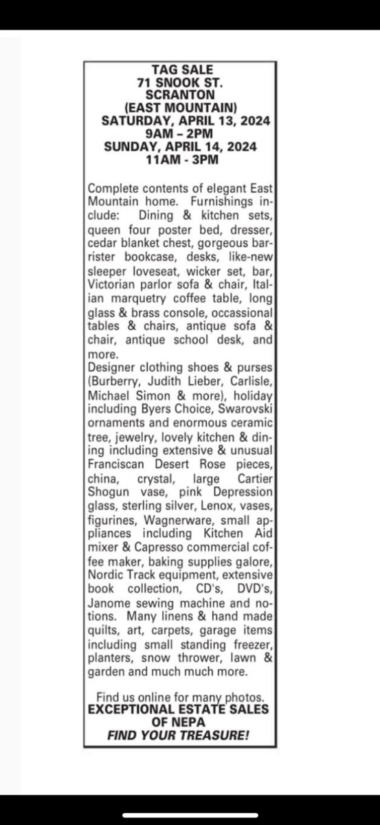 The address for this sale in Scranton, PA 18505 will no longer be shown since it has already ended. Dates