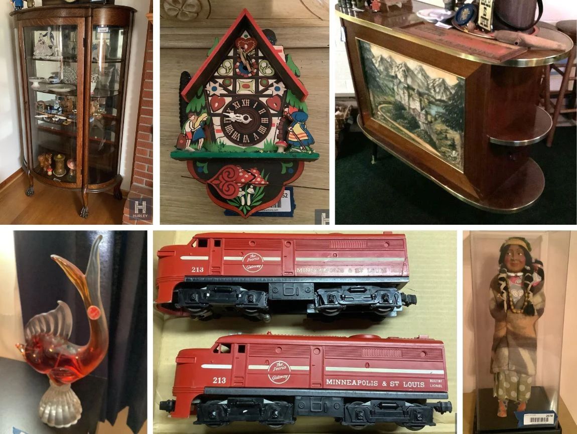 ONLINE NOW through Sept. 14! FURNITURE: Pool table; reclining sofa; recliner; 2 curved glass china cabinets; MCM bedroom set; bar; vintage bedroom pcs; wicker sofa & table/chairs; desks; bench; wall tables; filing cabinet; shelf units; workbench; patio table/chairs & settee; COLLECTIBLES/HOUSEHOLD: Yamaha organ; Black Forest carvings; German smokers; Art Deco clock; 1941 deer head mount; world travel souvenirs; Dresden-style figurines; limited edition prints; paint-by-numbers; Hull pottery; German punch set; Murano figures; stemware; Pyrex black snowflake; lighthouses; Skookum dolls; quilts; mesh purse; vintage Coca-cola cooler; advertising beer signs; car show trophies; antique typewriter; LP records; Fisher Price toys; blowmold snowmen; Christmas...