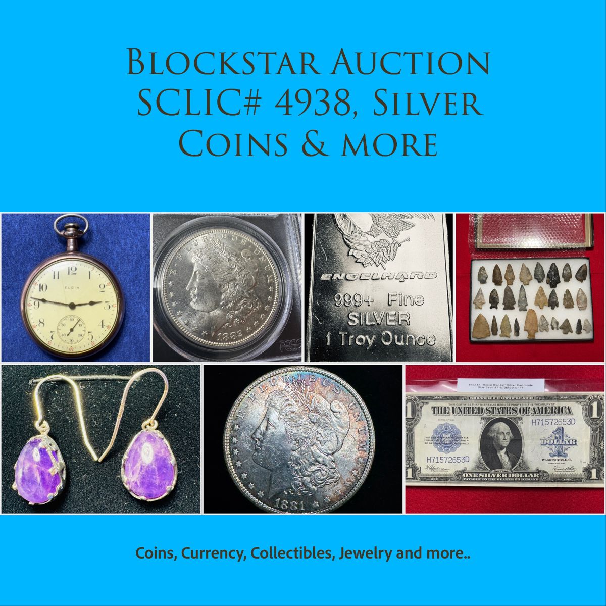 *BLOCKSTAR AUCTION SERVICE---SOUTH CAROLINA LICENSE #4938* THIS AUCTION FEATURES GRADED AND RAW SILVER COINS. SILVER JEWELRY. COLLECTIBLE US CURRENCY, UNIQUE TOYS, ART GLASS, WATCHES AND MORE. ITEMS INCLUDE BUT NOT LIMITED TO: *PCGS, NGC AND ANACS GRADED SILVER MORGAN DOLLARS *RAW UNGRADED SILVER MORGAN, PEACE, EISENHOWER DOLLARS *RAW UNGRADED SILVER BARBER, FRANKLIN, KENNEDY & WALKING LIBERTY HALF DOLLAR *RAW UNGRADED SILVER BARBER AND WALKING LIBERTY QUARTERS *RAW UNGRADED SILVER BARBER DIMES * $2 RED SEAL, $1 BLUE SEAL AND $1 LARGE SIZE SILVER CERTIFICATES *INDIAN HEAD CENT COLLECTION *KEYDATE PROOF AND MINT SETS * LEGOS, BATMAN, GI JOE, AND SWISS...