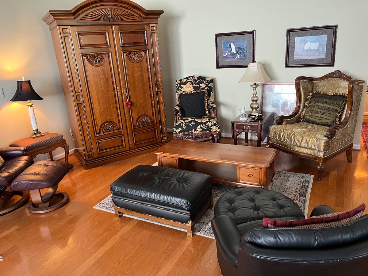 Something for everyone at this home. High end furniture with many MCM pieces Multiple brand new items in original box. There are several signed sports items that belongs to a retired Ford executive. Lots of designer high end women clothing and shoes. Brands include: Maitland Smith Pennsylvania House Royal Copenhagen Thomasville Henredon Simply Shabby Chic Colony Furniture Kenmore Regency House Waterford Cuisinart Griswold Neiman Marcus Onkyo DCM Escada Couture Laurel Emanuel Tadashi Andrea Jovine Carmen Marc Valvo Kay Unger Adrianna Papell Dana Buchman Salvadore Ferraganno Adolfo. Boltinge Restoration Hardware Over 35 very nice wrist watches that only needs new battery....