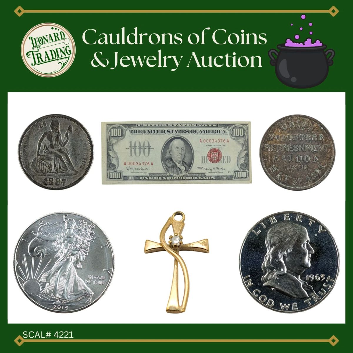 Cauldrons of Coins & Jewelry Auction Auction is Live from: 10/21-10/28 Lots start closing at 8:05pm EST on Tuesday, 10/28 Join us for the Cauldrons of Coin & Jewelry Auction featuring an impressive selection of coins and a stunning array of fine jewelry pieces. Don't miss this exciting opportunity to acquire rare collectible coins and beautiful jewelry pieces! Pickup is available in Greenville, SC on Wednesday, 10/29 from 3:00pm-5:00pm. Shipping is also available on most items. Bid now to enhance your collection! Featured Items include: 1966 $100 Note - Red Seal - Early Serial "00034376" Uncirculated 1883-CC Morgan Silver Dollar...