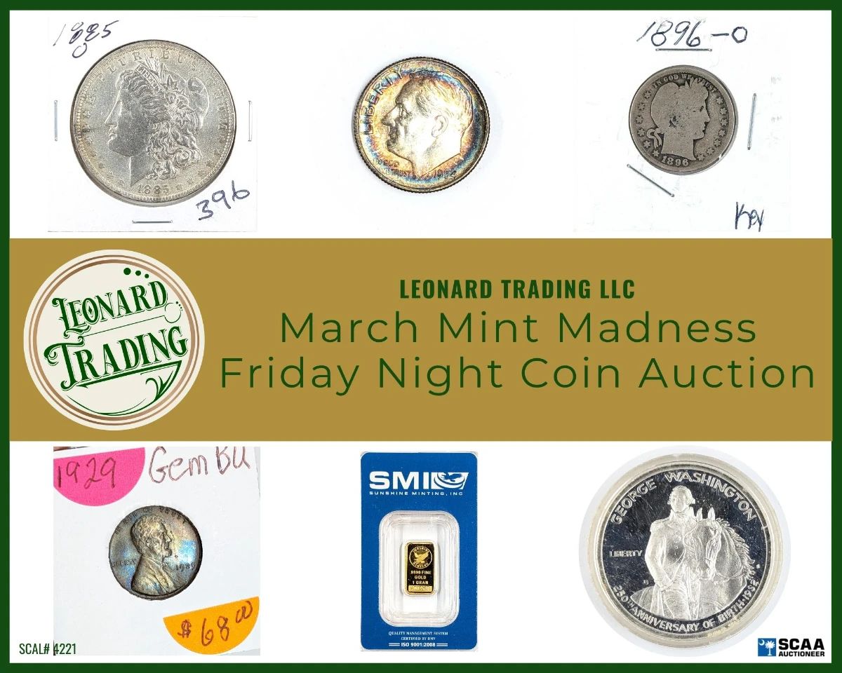 March Mint Madness Friday Night Coin Auction Auction is Live from: 3/20/26-3/27/26 Lots start closing at 8:15pm EST on Friday, 3/27 Join us for the March Mint Madness Friday Night Coin Auction featuring an impressive selection of coins. Don't miss this exciting opportunity to acquire rare collectible coins! Pickup is available in Greenville, SC on Wednesday, 4/1 from 3:00pm-5:00pm. Shipping is also available on most items. Bid now to enhance your collection! Featured Items include: 1914-S Wheat Cent- Key Date 1964 Silver Roosevelt Dime- Beautiful Toning 1929 Wheat Cent - Beautifully Toned, BU Additional Coin types include: Morgans Peace Dollars...