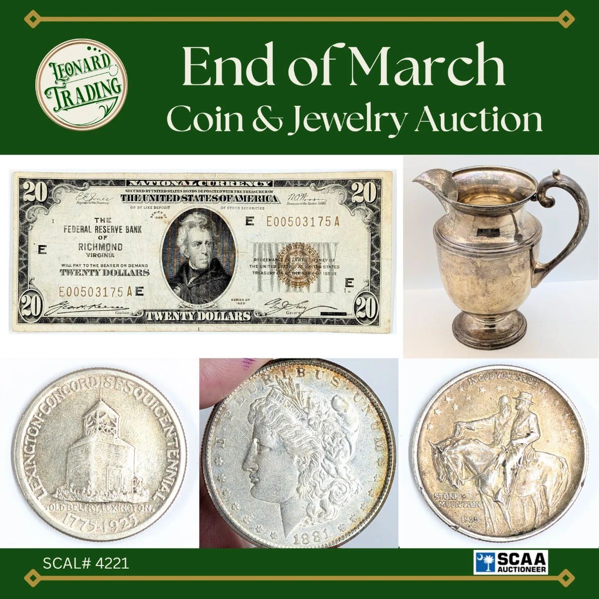 End of March Coin & Jewelry Auction Auction is Live from: 3/31-4/7 Lots start closing at 7:45pm EST on Tuesday, 4/7 Join us for the End of March Coin & Jewelry Auction featuring an impressive selection of coins and a stunning array of fine jewelry pieces. Don't miss this exciting opportunity to acquire rare collectible coins and beautiful jewelry pieces! Pickup is available in Greenville, SC on Wednesday, 4/8 from 3:00pm-5:00pm. Shipping is also available on most items. Bid now to enhance your collection! Featured Items include: 1925 Stone Mountain Commemorative Silver Half Dollar – Toned 1925 Lexington-Concord Sesquicentennial Silver...