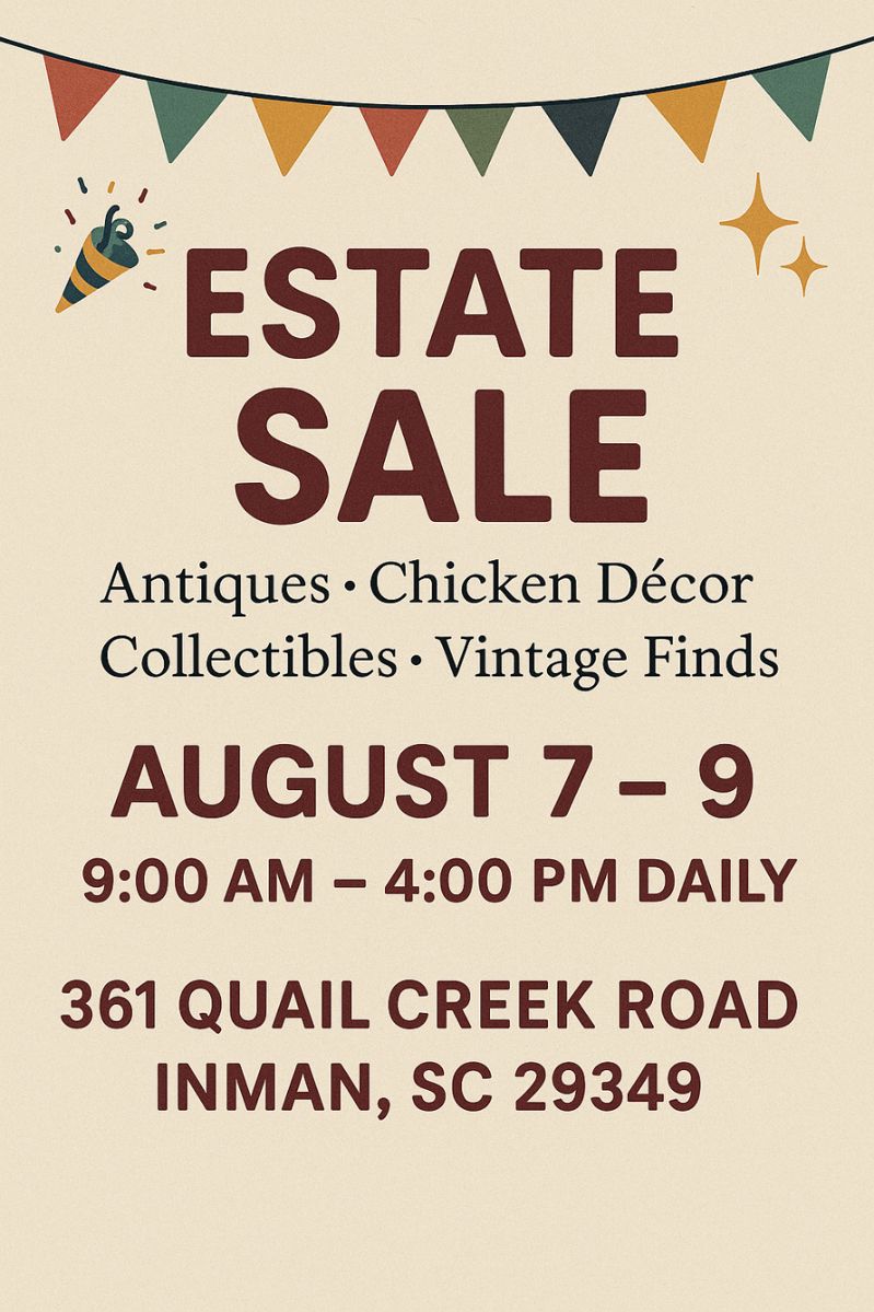 The address for this sale in Inman, SC 29349 will no longer be shown since it has already ended. Dates