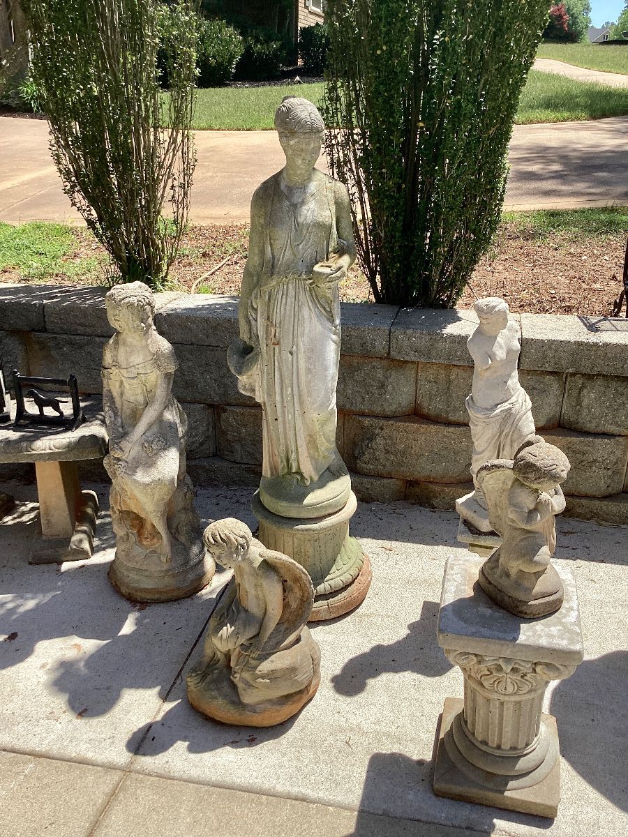 We reserve the right to open early to avoid congestion on the street. ENTER THRU GARAGE. CASH ONLY! Tons of garden figures, concrete and wrought iron benches, wrought iron tables and chairs, bird baths, wrought iron chase lounge, planters, and much more. We also have a pair of Drexel cherry end tables, executive office chair, printers, books, lots of pictures and TONS of lamps, lots of chairs. Lenox china, Wedgwood pitchers, Wedgwood Potpourri china set (8 place setting-55 pieces), lots of misc. china and glass, small desk, Singer sewing machine, lots of knickknacks, k ing bed, end table and dresser,...