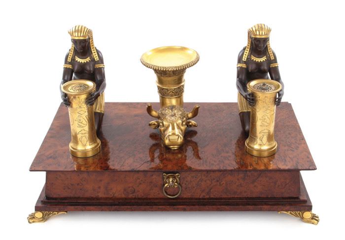 1 Regency bronze and burl-yew inkstand, Alexis Decaix US$ 5000-80002 Louise Phillipe ormolu and glass striking mystery clock, Robert-Houdin US$ 7000-100003 Gordon Bradt Seven-Man kinetic clock, Kinetico Studios US$ 400-6004 Pair French Empire parcel gilt-bronze 'Au June Negre' candelabra (2pcs) US$ 3000-50005 Pair Empire Paris porcelain centerpieces, attributed to Schoelcher (2pcs) US$ 800-14006 French carved marble Napoleon silhouette US$ 1000-20007 Pair French ormolu-mounted opaline glass candelabra (2pcs) US$ 700-10008 Pair French toleware Hercules figures (2pcs) US$ 400-7009 Pair Louis Philippe ormolu-mounted opaline vases (2pcs) US$ 700-90010 French Empire style cassolette US$ 600-90011 Pair Classical bronze-mounted rouge marble columns (2pcs) US$...