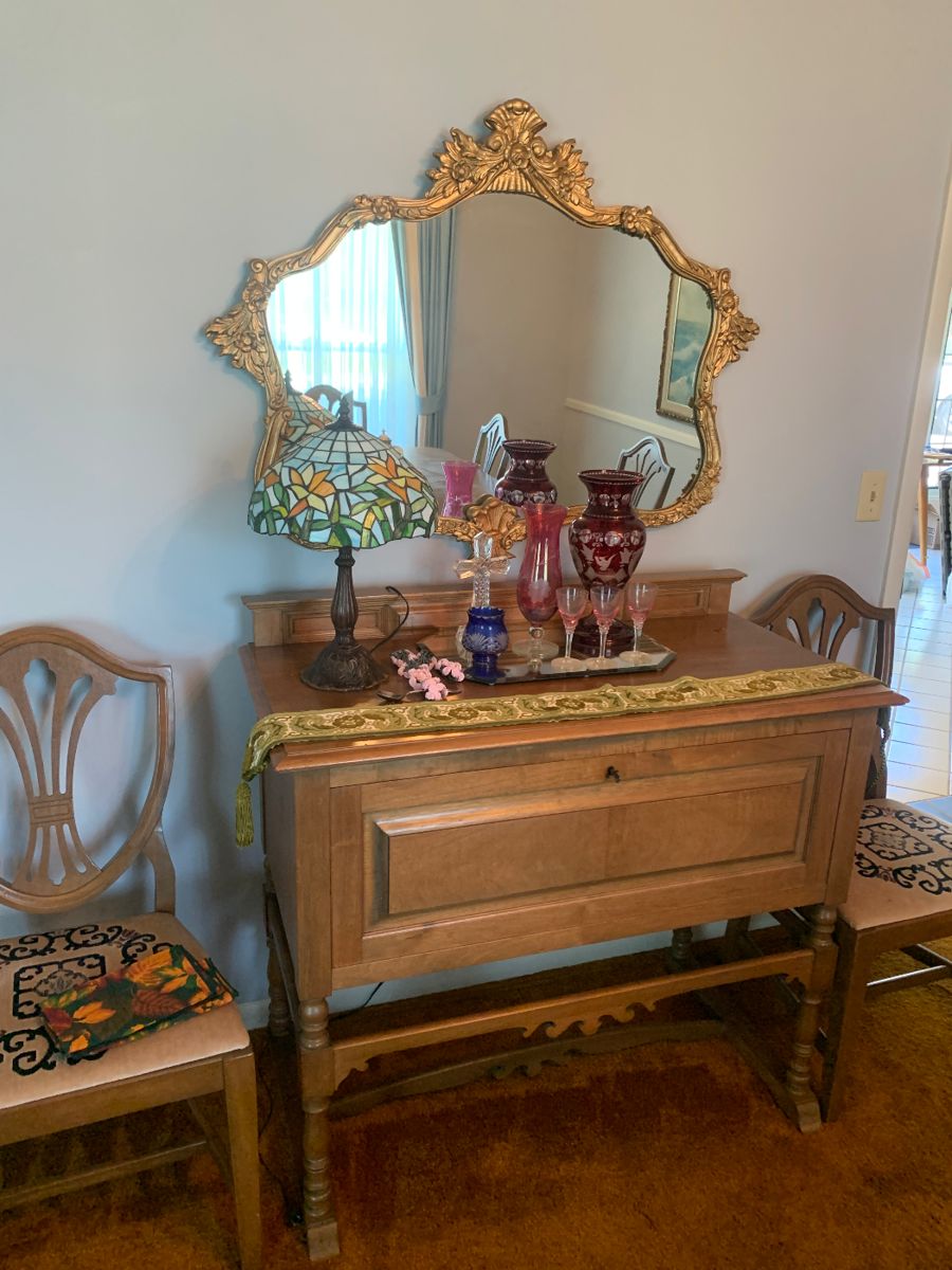 Estate Sale in Brentwood with a century of furnishings. Furniture: Dining table and 6 chairs, buffet, antique victorian settee, sofa, side tables, kitchen table, glass top patio table and chairs, wicker furniture, couch, side chairs, king size bed and mattress, vanity, desk, sewing table, shelf, kitchen hutch, china cabinet, refrigerator, washer and dryer Kitchen: dinnerware, antique glassware, blue transferware, red transferware, cookware, Tupperware, cast iron, pottery, teapot collection, small kitchen appliances Garage: Christmas decor, drills, some tools Decor: wall art, original oils, Gone with Wind lamps, glassware Other: women's clothing, jewelry, books, TV, cassettes, albums, CDs
