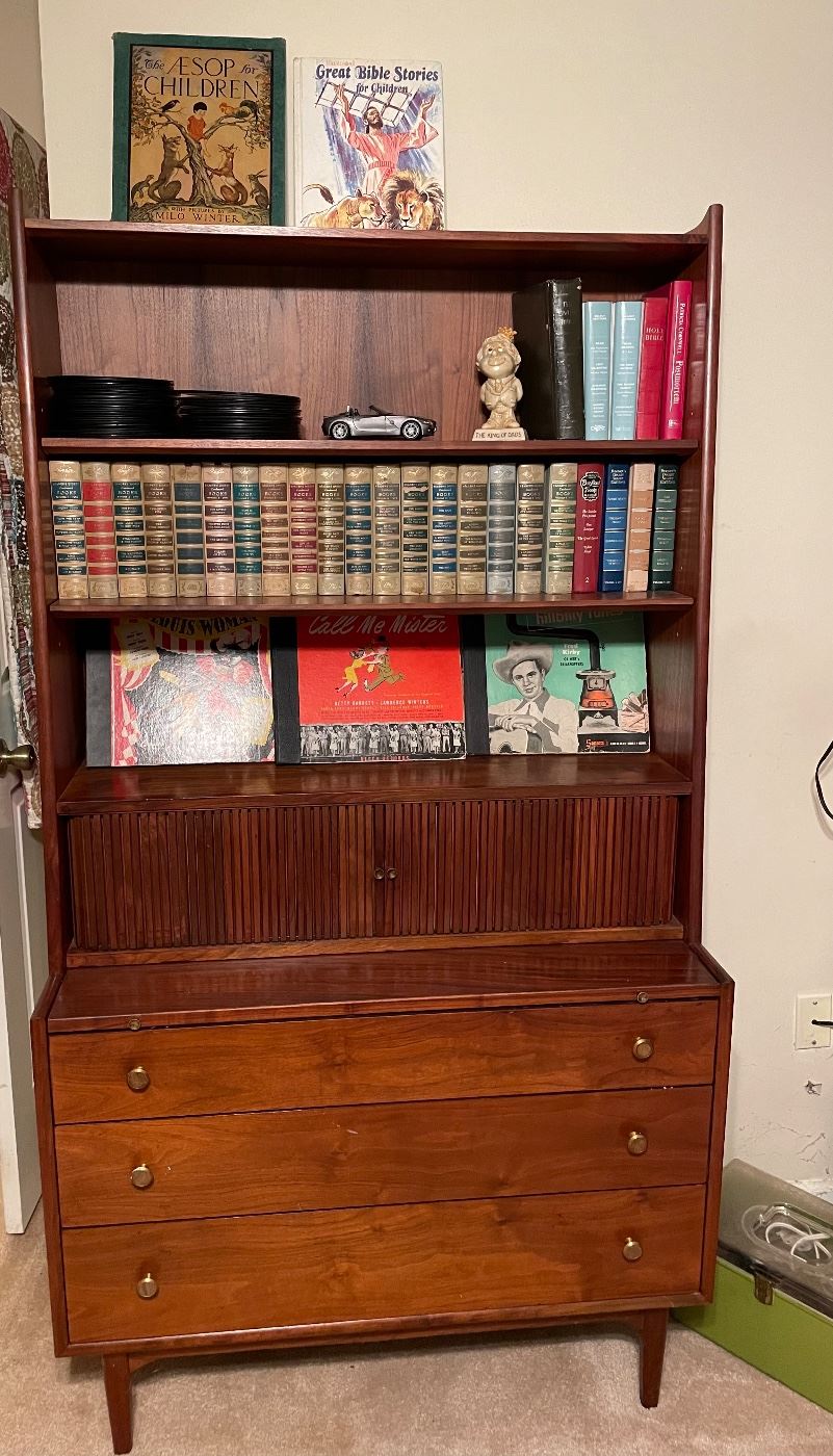 DREXEL MID CENTURY BEDROOM SUITE DRESSER TWO NIGHT STANDS DISPLAY CABINET/ SHELF WITH ACCORDION DOORS DRESSER WITH MIRROR AND BED FRAME, MCCARTY POTTERY, ETTA B POTTERY, VINTAGE JEWELRY, DINNING TABLE AND EIGHT CHAIRS, DAYBED, DESK, STORAGE CABINET, UPRIGHT LARGE FREEZER, REFRIGERATOR, WASHER AND DRYER, TOOLS, ANTIQUE PEDAL CAR, GOLF CLUBS, MOWERS, BOOKS, ANTIQUE SOFA, RECORDS, ROUND TABLE AND 4 CHAIRS, NINTENDO GAMES, PLAYSTATION GAMES, TV, MID CENTURY NIGHTSTANDS, BOOK SHELVES, KITCHEN ITEMS, PYREX, MICROWAVE, WEXFORD, ROLL TOP DESK, TOOLS, HAND TOOLS, YARD TOOLS, TOOL CHEST, WROUGHT IRON TABLE AND CHAIRS, WROUGHT IRON PAIR OF BOUNCING CHAIRS, KAYAK, CLEANING SUPPLIES, WOMENS...