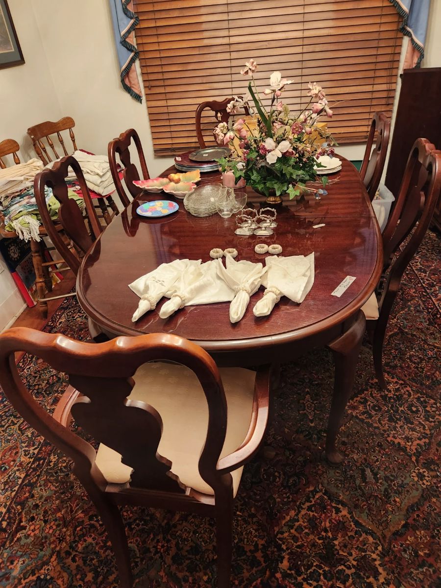 Mid century headboard & footboard on full size mattress & box springs Side table Accent table King size headboard, mattress & box springs Antique chest Wood file cabinet Cherry dining table Cherry china cabinet Kitchen table w/4 chairs Pits & pans Dishes Flatware Washer & dryer Refrigerator Microwave Microwave stand Glass coffee table Large wall mirrors 2 large floor rugs 3 vintage crocks Vintage 8track, turn table, radio stereo Cherry Armoire Knick knacks Floor mirror Ladies clothes Bedding Towels & hand towels Table linens