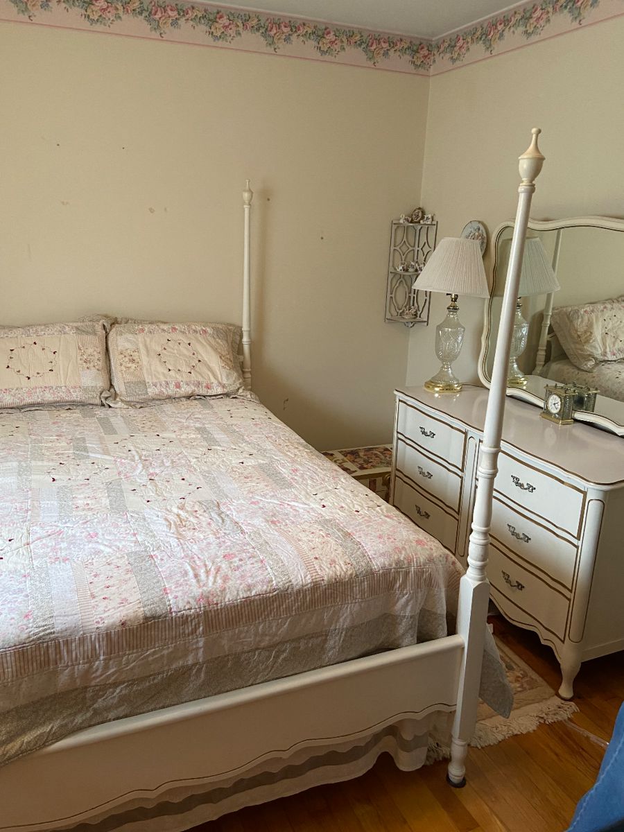 There is a lot of great stuff, a mid century bedroom set, mid century glassware including cocktail glasses, cool lamps, a large pink ashtray, a 60’s console perfect to reinvent. It would be lovely to do a cool “Dwell hotel” vibe with. We have a mid century very cute bed with railings, an Eastlake settee and 4 matching chairs, a tall carved eastlake bed with bed rails. There are a few depression glass pieces, several couches, one sleeper couch with matching smaller couch all in mint condition. We have some patio furniture, a wicker set and a small iron table...
