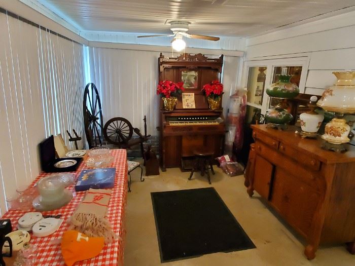 This estate is loaded with all sorts of farm/country home antiques and collectables as well as tons of tools and general home decor...3 bird baths, Grandfather Clock, cast-iron Cafe table, concrete table, plows, seeder, antique lawyer bookcase, books, Mason collectables, and Oak Ridge collectables, Local items, Records, political collectables, old dolls, farm house dining table with chairs, electronics, books, dvds, cds, cloths, filing cabinet, linens, 4 antique pump organs, Samick upright piano, 2 butter churns, antique Victrola, 2 crank phones, 2 peddle sewing machines, huge collection of Jewel Tea Dishes, coke collectables, lots of cut and press crystal, Pyrex, FK,...
