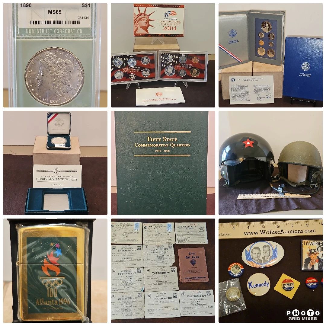 Slabbed Silver Dollars, Proof & Uncirculated Sets, Coins, War Ration Booklets, Stamps, & MORE Collec