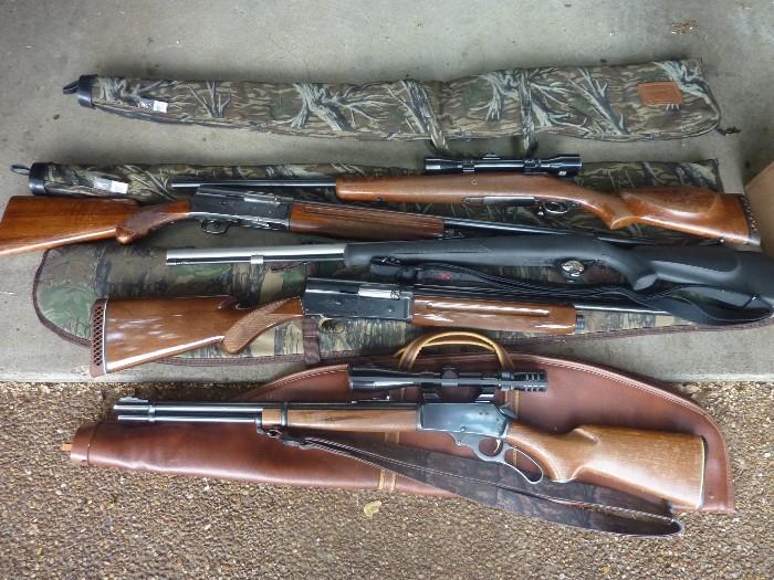 Gun Safe - 16 guns, combination lock (at desk) (5) guns - details as follows: Browning Auto 5 Invector Plus 26in 12 g shotgun, Browning Auto 5 - "1953" 12g, CVA Apollo Muzzleloader .50cal, Remington Model 700 Series 30-06 cal, Marlin Lever-Action Model 336 30-30 cal Trailer - open utility, mesh with lock 4x6 Leather Sofa Antique ladies desk -slant front with leather inlay Antique chest of drawers (2) sets of Queen Mattress/Set - like new, exceptional condition Large selection of Fostoria Several pieces of Waterford, Tiffany and Block crystal Very large selection of jewelry, including stones, watches, some gold,...