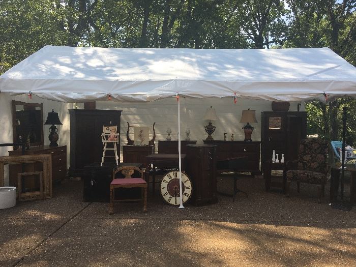This Estate Sale will be under a large tent and basement of home. This estate sale consist of items from my late mother, my grandparents, my brother, my great aunt and father in law. Furniture, lots of glassware, figurines, old school desk, wash stand, chifferobe, chest, armoire, vintage sewing machine, antique trunk, chairs, tables, lamps, pictures, old windows, bedroom suite, recliner lift chair, outdoor furniture, vintage books, linens, and lots more!