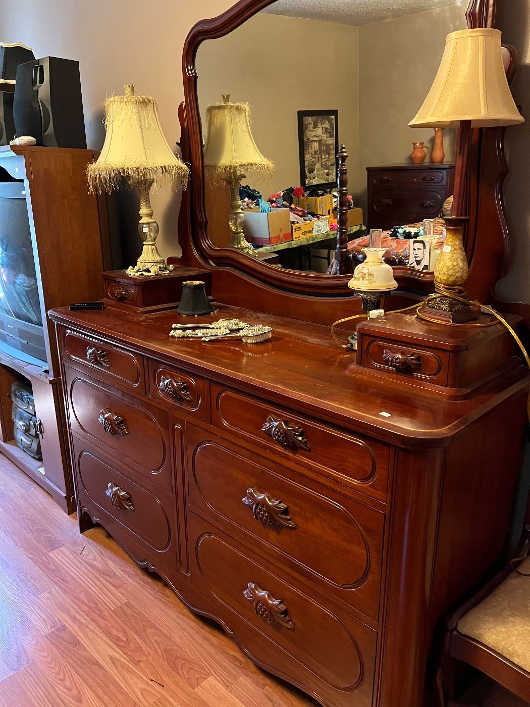 There will be great treasures at this home. The owners Mother worked at Davis Cabinet and helped make the Lillian Russell cherry bedroom suite we have for sale! There is a queen size bed with mattress set, extra large dresser with mirror, "chester" drawers, 3 drawer night stand and a pair of candlesticks. There is also a bar height drop leaf table with 2 chairs, sofa, side chairs, coffee tables, nesting tables, wingback chairs, floor jewelry box, round inlaid wood table, antique trunk, dresser, "chester" drawers, nightstand, bed, curio cabinet, lamps, bench, side tables, crystal, linens, china, Depression glass, antique...