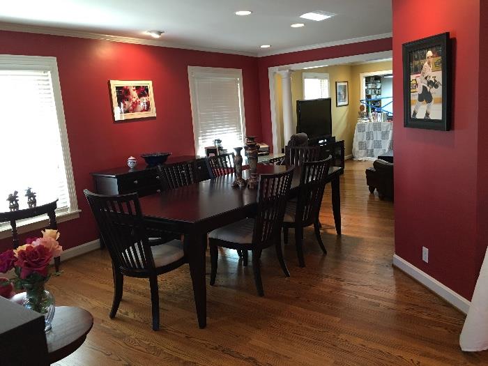 Newer furniture and home furnishings in this Green Hills home. Dark stained dining table with 8 modern chairs extended by two leaves and matching side board, living room end tables and large coffee table with storage, flat screen Vizio tv and console with brush nickel hardware, signed Predators items - framed art, jersey, and banner. Costume jewelry, signed wall art, books, Lenox China, Mikasa crystal drinkware, kitchenware, various appliances, reclining Laz-e-Boy Sofa and reclining loveseat, 2 desks, King size bed, end tables, tall chest, and dresser with mirror. Women's clothing, designer bags, shoes and home decor. The garage is filled...