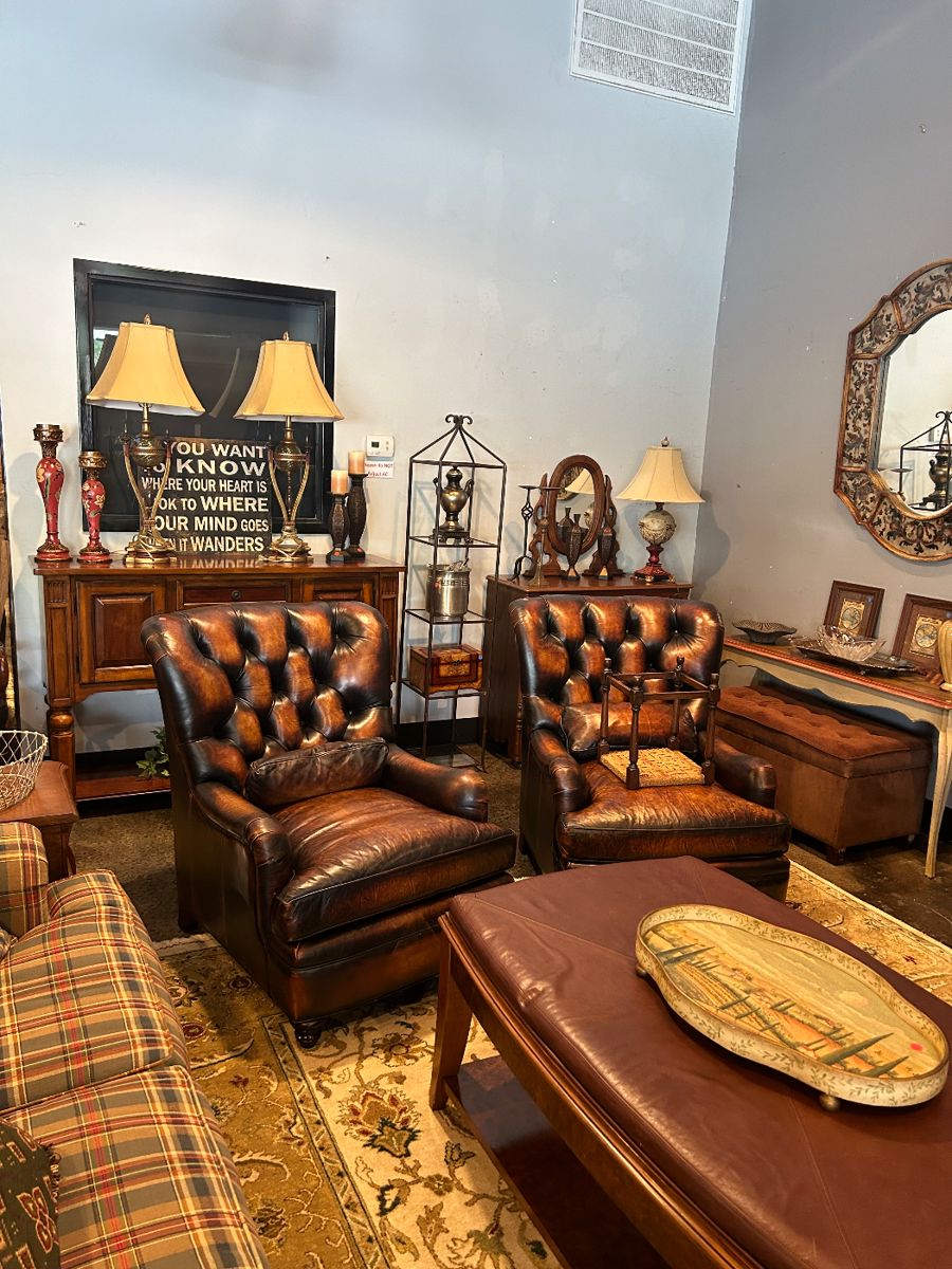 Early Drop Front Secretary Desk, Pair of Our House Design Leather Chairs, Small Antique Wine Tasting Table, Early Inlaid Oval Paper Mache Tray on Stand, Pair of Barrel Back Chairs, Thomasville 10 Drawer Dresser and Matching 3 Drawer Chest, Hand Painted Tray Table on Bamboo Tripod Base, Set of 8 Slat Back Dining Chairs, Pair of Lilly Industries Club Chairs, Michael Thomas Sofa, Fairfield Leather Studded Office Chair, Bradington Young Swivel Chair, Maitland Smith Leather Top and Wood Table/Desk/Console, Randolph Macon Women’s College Captain Chair, Pair of Stanford Spindle Armchairs, Thomasville Plaid Sofa, Trestle Style Dining Table with 8 Rush...