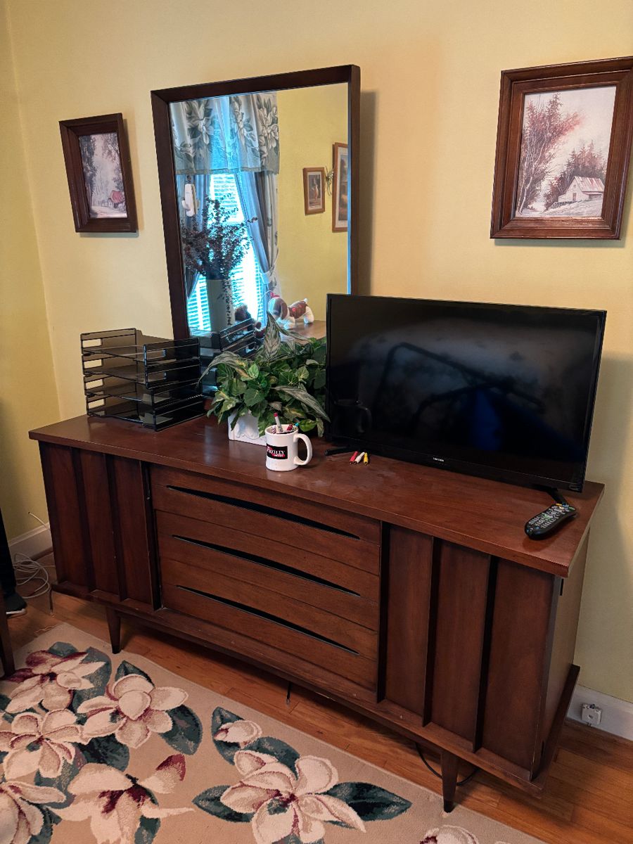 This is such an adorable home! There is a fantastic mid century bedroom suite to include bed, dresser, "chester" drawers, dresser with mirror and nightstand, mid century velvet sofa, mid century floor lamp, great vintage TV, cedar chest, vintage kitchen table and chairs, 1930's bed with matching "chester" drawers, nightstand and dresser with mirror, end tables, nightstands, lamps, small drop leaf kitchen table with 2 chairs, pretty pair of twin beds, vintage sofa, quilts, coffee table, end tables, lamps, plants, clocks, TV stand, TV, side table, antique trunk, Crooksville china, entry hall table, cherry dining room table and chairs, china...