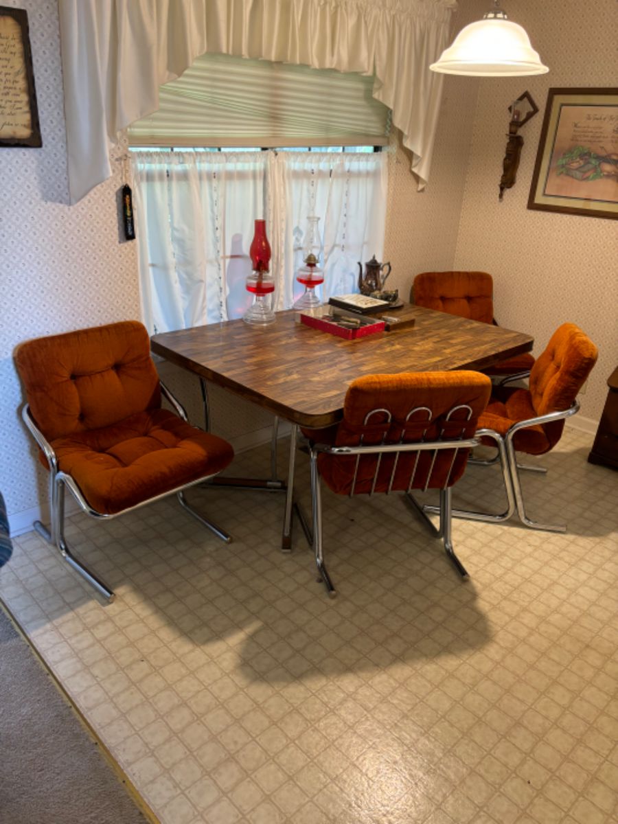 This home has a sofa, loveseat, recliner, dining room table and chairs, bedroom furniture, "chester" drawers, dresser, king size bed, floor model jewelry box, night stand armoire, lava lamp, vintage folding TV trays, entry hall table, curio cabinet, cuckoo clock, nightstands, twin beds, wingback chair, vintage stereo console, 1980's dining room table and chrome and velvet chairs, china hutch, kitchen wares, pots and pans, cast iron, rugs, angel collection, lots of flashlights and head lamps, Harley Davidson lamp, clocks, music box collection, mirrors, pair of Gone with the Wind lamps, vintage wall art, books, cookbooks, lamps, kitchen wares, Corning Ware,...
