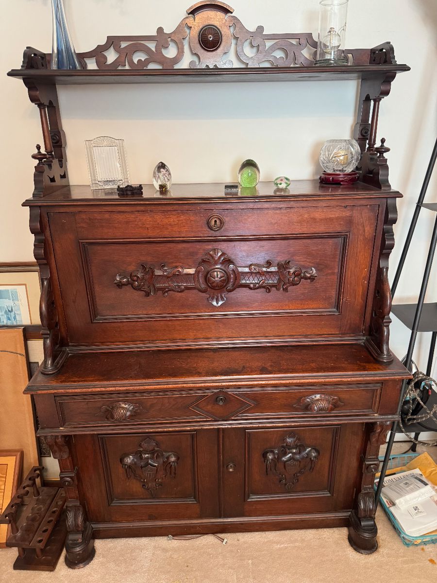 There is a beautiful antique desk, gorgeous antique oil painting, kitchen table and chairs, vintage dresser, gorgeous entry hall table, Bohemian glass decanter and glasses, Mary Gregory hand painted glass, Lenox "Clarion" china, duck stained glass, clocks, ammo, knives, great pipe collection (some antique Meerschaum), toy vehicle collection, nice oak plant stand, signed prints, small dresser, sofa, recliner, dining room table and chairs, kitchen island, brass/glass small curio cabinet, nice curio cabinet, miniatures, Grandfather clock, crystal, rugs, love seat, kitchen wares, pots and pans, bedroom furniture, Hummels, binoculars, lamps, side tables, books, prints, mattress set, vintage toys, Hot Wheels, deer...