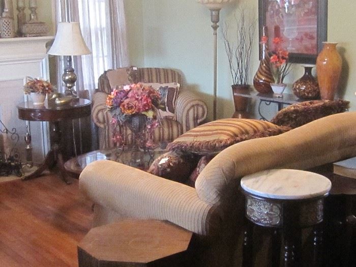 Partial List-FURNITURE: Victorian platform rocker-mahogany pedestal drum table-empire revival style marble top table-pair Asian style pedestals-marble top pedestals-cocktail table-overstuffed chair-granite topped console table-neutral sofa-handcrafted pine table-oak TV stand-kneehole desk-Queen Anne console table-bar stools-fauteuil style chair-birdhouse motif table-lighted corner curio-Craftsman style dining table w/6 chairs-carved Chippendale style end table-drop leaf rolling server-oak pedestal dining table w/4 bowback chairs-small baker’s rack-shabby chic metal corner shelf-entertainment armoire-Victorian oak bed w/tall headboard-pair slipper chairs-file cabinet-office chair-contemporary desk-night stands-small console table-Brother sewing machine w/cabinet-Singer sewing machine w/cabinet-pair midcentury style upholstered chairs-pair French style chairs-queen size bed-bookcase-painted French style chair-folding sewing rocker-bentwood chair-midcentury end table-oak slant...