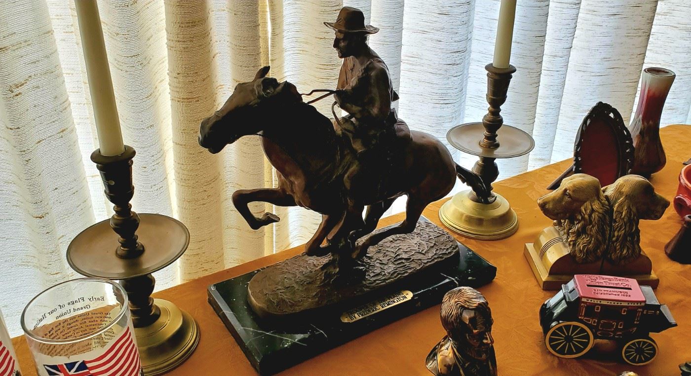 Artwork(Tom Caldwell) Coin Collection(U.S/Foreign/Roman Empire/Indian Penny), Costume Jewelry, Remington "Trooper on the Plains" Bronze Sculpture, Fenton Hobnail Shoes, Glass Animal Figurines, Late 1800's Lakeside Parlor Organ, 1900's Tiger Oak Side by Side w Leaded Glass, Antique Piano Stool, Franco Laminica "Noah and the Dove" Plate(1984), Vintage Brass Hat Rack, Miniature Cast Iron Amish Figures, Small Lincoln Bust, Brass Figurines, 1940's Child Buggy, Antique Sideboard, Naken/Oneida/Rogers Bros Silverplate Flatware, Antique Dining Table w 4 Chairs, Antique Singer Sewing Machine, Dolls, Vintage Barbie Case, Linens, Rest-O-Matic Adjustable Bed, Wooden Desk, Glider w Ottoman, 3 Tier Computer Desk, Bookshelves, Books, Women's Clothes, Purses,...
