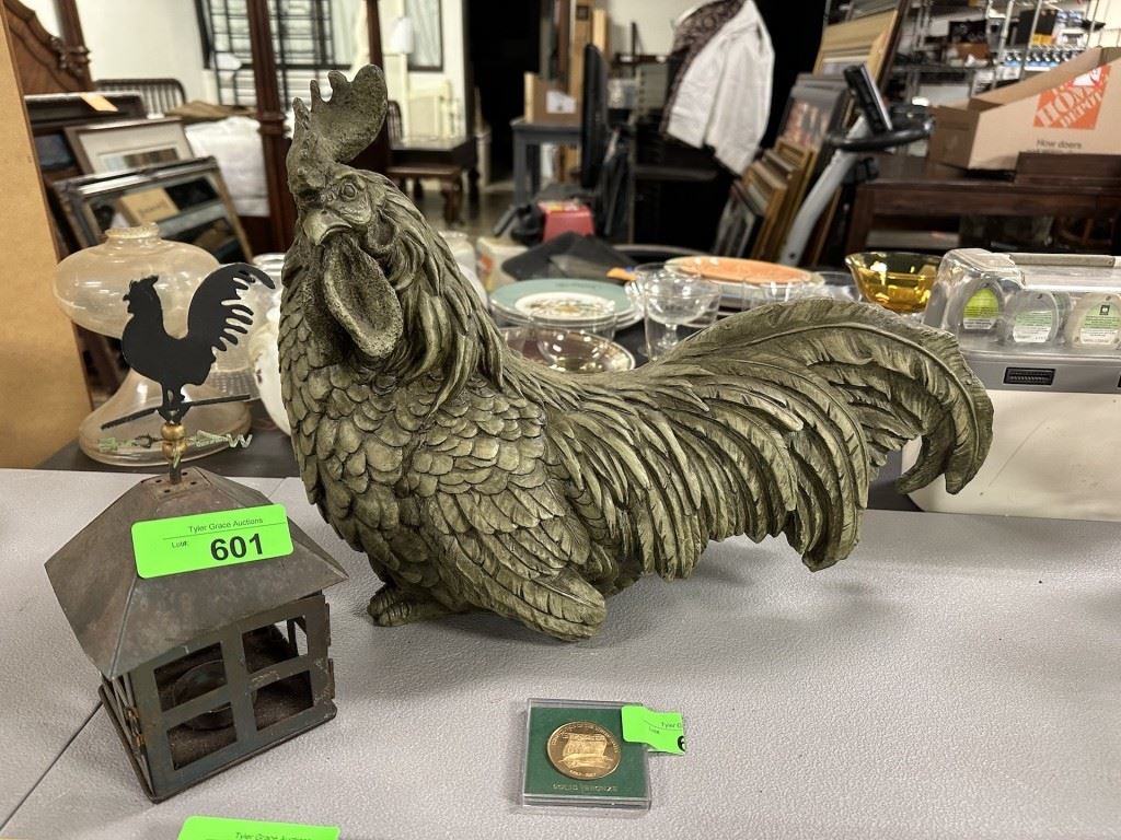 Lot Number Lead 601 LARGE ROOSTER DECOR PIECE AND SMALLER HURRICANE 602 VINTAGE PINOCCHIO BOOK GREAT ILLUSTRATIONS 603 CONSTITUTION OF THE UNITED STATES BRONZE COIN 604 LARGE LOT OF DISNEY MOVIE LITHOGRAPHS / PRINTS 605 VINTAGE METAL BASED CENTERPIECE / COMPOTE 606 LOT OF MISC STAMPS 607 VINTAGE HANDMADE THROW RUG / MAT 608 BOX LOT OF MISC HOUSEWARES W BASKET 609 ARCHED TOP TRUNK / STORAGE 610 VERY LARGE AUSTIN SCULPTURE OF A CAT 611 VINTAGE OTTOMAN / FOOTSTOOL 612 VINTAGE BEADED CLUTCH PURSE / HONG KONG 613 VINTAGE DIECAST CAR / TESTORS 614 PRETTY LIDDED BOX 615 PRETTY...