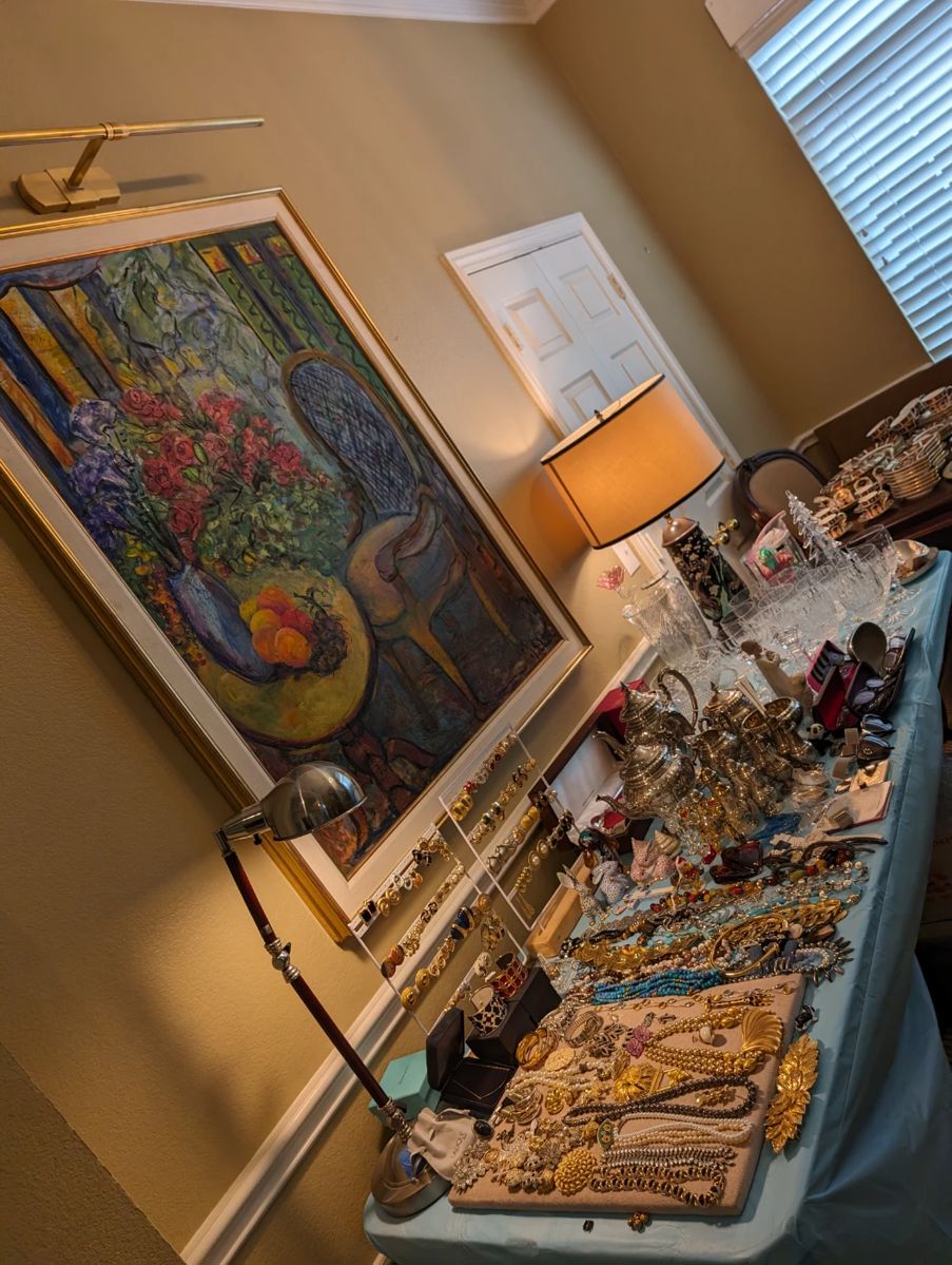 We're in Addison this week! Jewelry (Lalique, 14kt gold, Sterling, Brighton, Waterford necklace, Rhinestone necklaces, Eisenberg Brooch & Earrings, Swarovski, Monet, Napier, Costume jewelry) Art by Texas Artist Dollye Ballenger Royal Crown Derby "Old Imari" (48 Piece Service for 8 set, Soup Tureen, Candle sticks, Crescent plates, Covered casserole, Oval platter, Demitasse cups + saucers, Cream soup bowls, Fruit bowls) Sterling (Towle "Royal Windsor" sterling coffee service, Francis I sterling salt & pepper shakers, Towle sterling salt & pepper shakers) Collectibles (Lenox "Autumn" china, Waterford "Colleen", Waterford, Simon Pierce crystal, Baccarat, Swarovski, Herend, Murano, Cut Crystal, Radko Shiny Brite ornaments,...