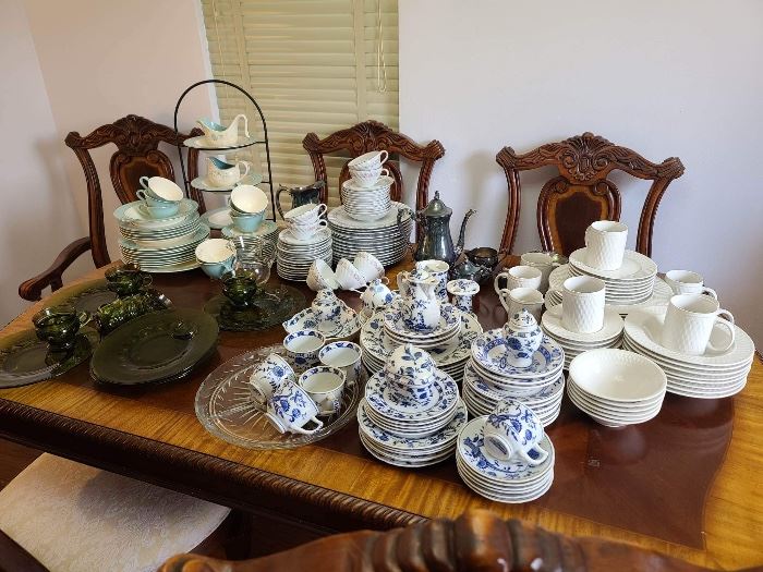 Catering kitchen equipment vintage costume jewelry vintage china grandfather clock Christmas decorations in boxes White princess twin beds and nightstands gorgeous carved dining table, 6 chairs and huge china hutch vintage furniture office furniture and equipment chairs children’s furniture religious items paintings and prints mirrors Vintage diner dishes mid-century bar cart ottoman boudoir sofa mid-century end tables, coffee table and lamps silver-plate flatware medical aids vintage doilies vintage military catering items
