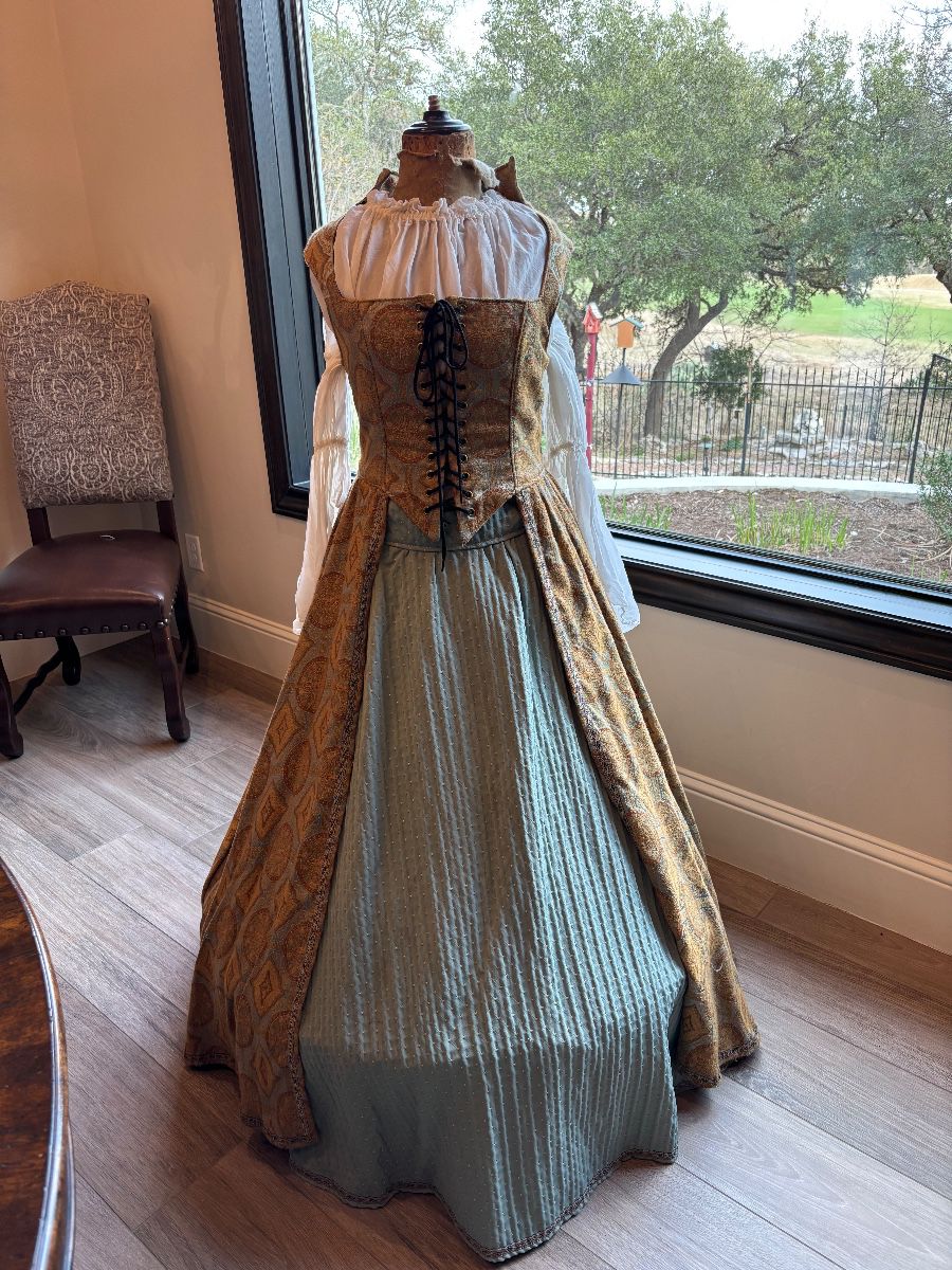 A LARGE SELECTION OF GORGEOUS RENAISSANCE (PEN DRAGON) ENSEMBLES INCLUDING SHOES, HATS, FANS, PURSES AND JEWELRY