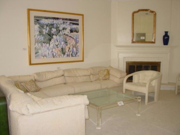 Small immaculate sale, with quality furnishings. Sale includes: 70s vintage sectional and ottoman upholstered in off-white crewel fabric, 70s Vintage acrylic coffee table, Nice decorative oil paintings, watercolors, prints, Gorham "Fairfax" sterling flatware, other sterling and silverplate holloware (removed from premises until day of sale), Mirrors, lamps, decorative accessories, china, Blue denim sofa sleeper by "Hickory," like new, Charming queen size painted four poster bed, Pair of French style twin beds, matching dresser and chest with hutch, Mid-century dining table and console with formica tops, chair, Vintage round kitchen table with formica top, Pair of bar stools, Set of 4...