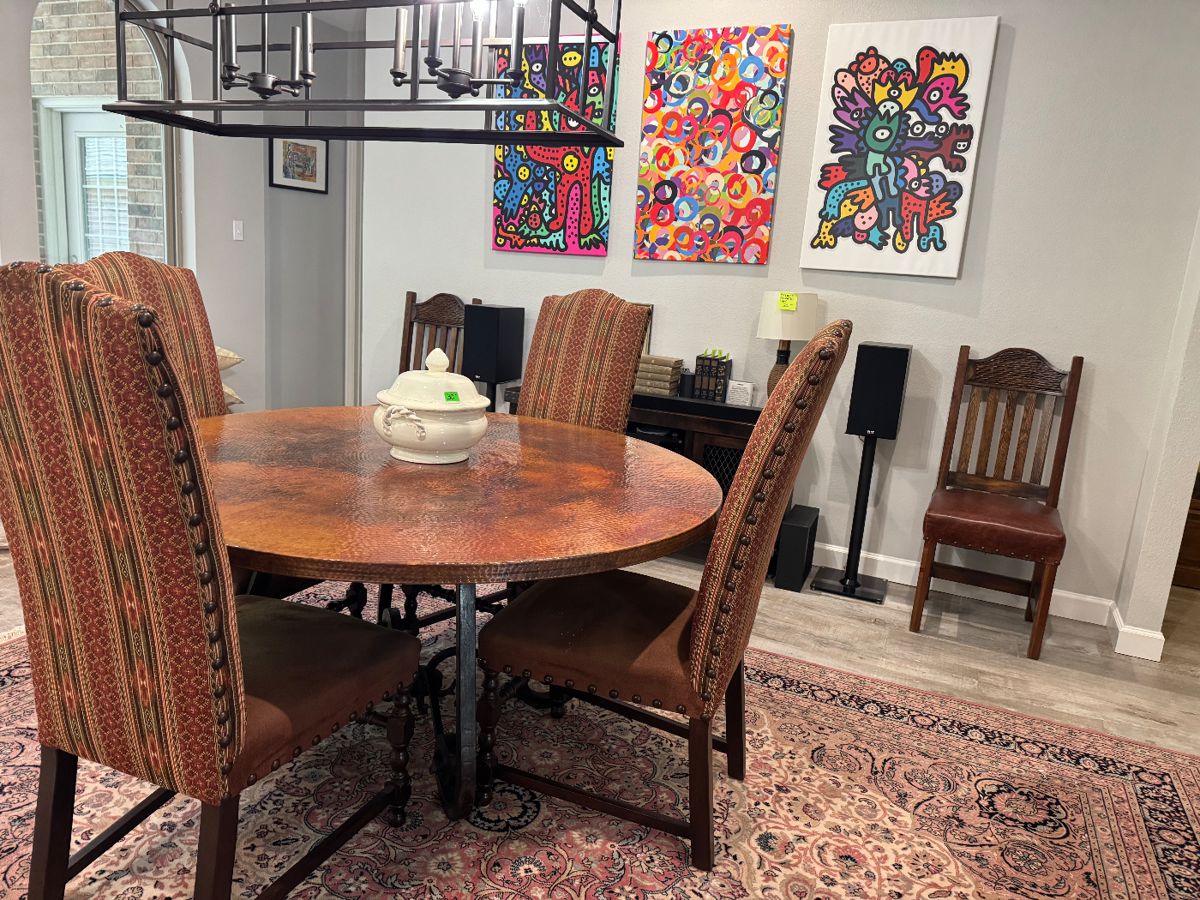 Beautiful Estate Sale this week! We have a fantastic collection. Here are a few of the items that will be at the sale.... - Copper dining table - Dining chairs - Entertainment center - Rustic style coffee table and end table - Pop art - Area rugs - Stereo equipment - Artwork - Love seat - Chair and ottoman - Throw pillows - Lateral filing cabinets - Office supplies - Projector - Grandfather clock - Men's and women's clothing - Men's and women's shoes - Costume and nice jewelry - some vintage clothes - Dressers - chest of drawers -...