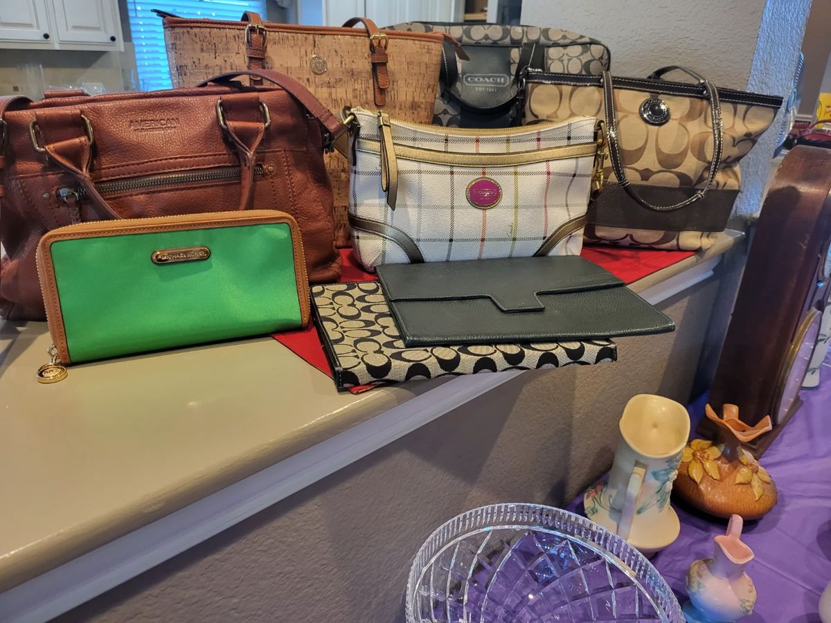 • Swarovski Crystal Ambiray Candle Holder Set • Coach Handbags • Anne Klein Handbag • Michael Kors Wallet • Ithaca Double Dial Calendar Clock • Mottahedeh Vista Alegre Summer Fruit • Vtg Rare Mottahedeh Porcelain Vase • Roseville Pottery • Vintage Hull Art Pottery • Stetson Cowboy Hats • 2 Saturday Evening Post Magazine John Kennedy • Jim Shore FURNITURE: • Shabby Chic Painted Coffee Table and End Table • Drop Leaf Cocktail Table • Vintage Hand Painted Glass Bowl • Gorgeous Area Rugs • Home Decor • Hand Painted Shabby Chic Wood Cabinet Black • Beautiful Antique Victorian Marble...