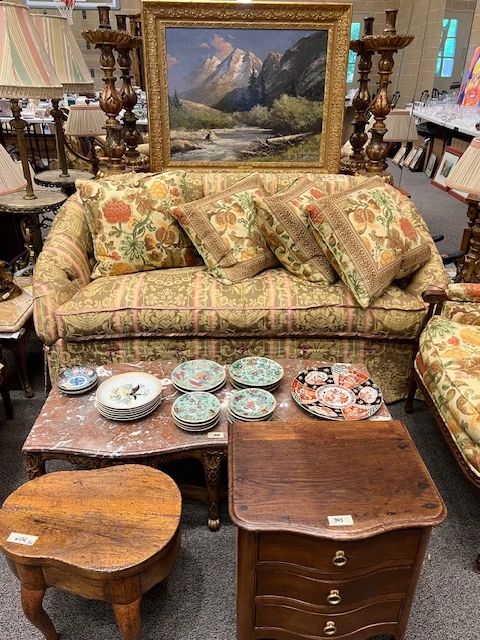 Antique Louis XV Two (2) Part Buffet, Antique Carved French Settee, Pair of Carved Louis XVI French Armchairs, Antique French Trumeau Mirror, Pair of Large Gilded Wood Candlesticks, Antique Religious Oil Painting in Gold Rococo Frame, Large Terracotta Figure by George Coudray, Terracotta Statue by Cordier, Two (2) Small Oval French Coffee Tables with Marble Tops, Several Antique Foot Stools, Two (2) Original Oil Landscapes by Robert Wood, Original Oil Landscape by Hermann Herzog, Small Oil Landscape by Peter Hohnstedt (1871-1957), Small 19th C Painting of Christ on the Cross in Ornate Gold Frame, Original Icon, Large Collection of Old...