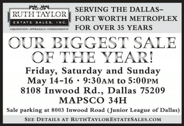 OUR BIGGEST SALE OF THE YEAR! Rain or Shine Friday, Saturday and Sunday May 14 - 16, 2010 9:30AM to 5:00PM 8108 Inwood Road Dallas 75209 Mapsco 34H ** Sale parking at 8003 Inwood Road (Junior League of Dallas) ** Items originally purchased from the Greer Garson Estate: Bargueno (carved fall front desk on stand) 19th Century Serpentine Front Chest Welsh Dresser Two Brass Tea Carts Area Rug Staffordshire Figures Celadon Lamp Marble Top Dining Table Four Chrome and Leather Chairs Artwork Three Glass and Chrome Side Tables Credenza by Century (Letters of authenticity included) Other items included in this...