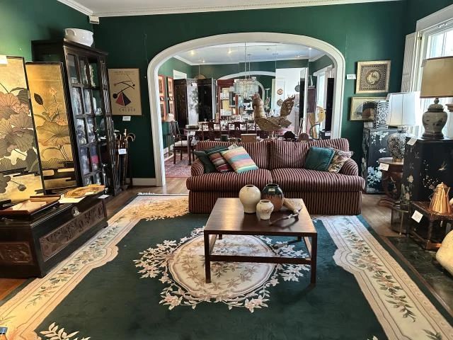 We’re starting out the 2026 New Year with a full house and a separate weaving studio. If you’ve ever had the aspiration to take up weaving, there is a full size 60” LeClerc loom, as well as a table top loom on stand, and various weaving equipment and a selection of nice yarn. The studio also has a group of six leaded glass windows—Now, let’s head to the main house, where we have several nice oriental and Chinese rugs that were just professionally cleaned. Very eclectic sale with many collectibles, from mid-century classics to Chinese. LIVING ROOM · Traditional sofa...