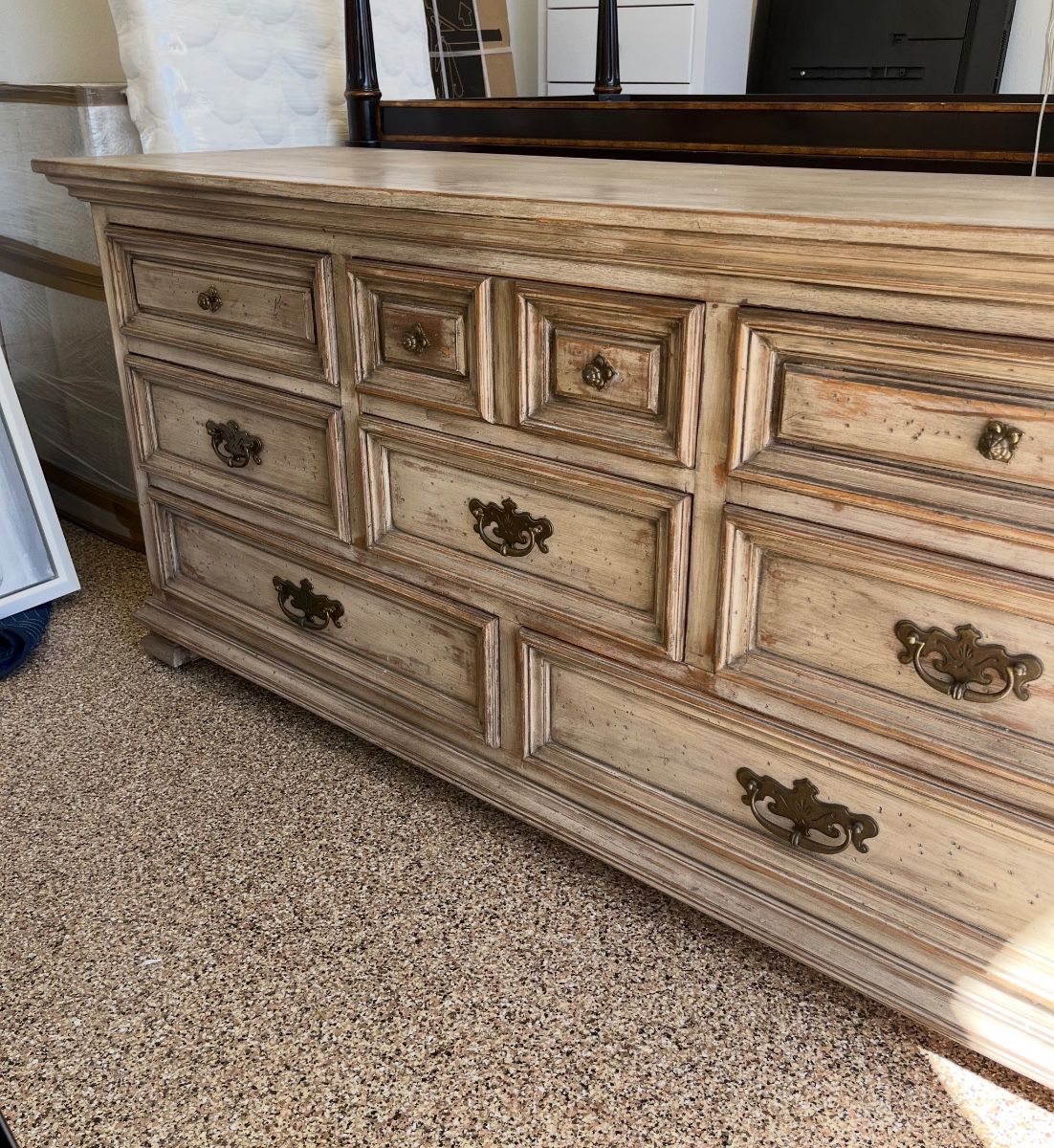 Pairs of chairs, china, stools, ottomans, dressers, large mirrors, English hall stand, designer pillows, antique rugs, custom sectional banquette, lighting, drapery.